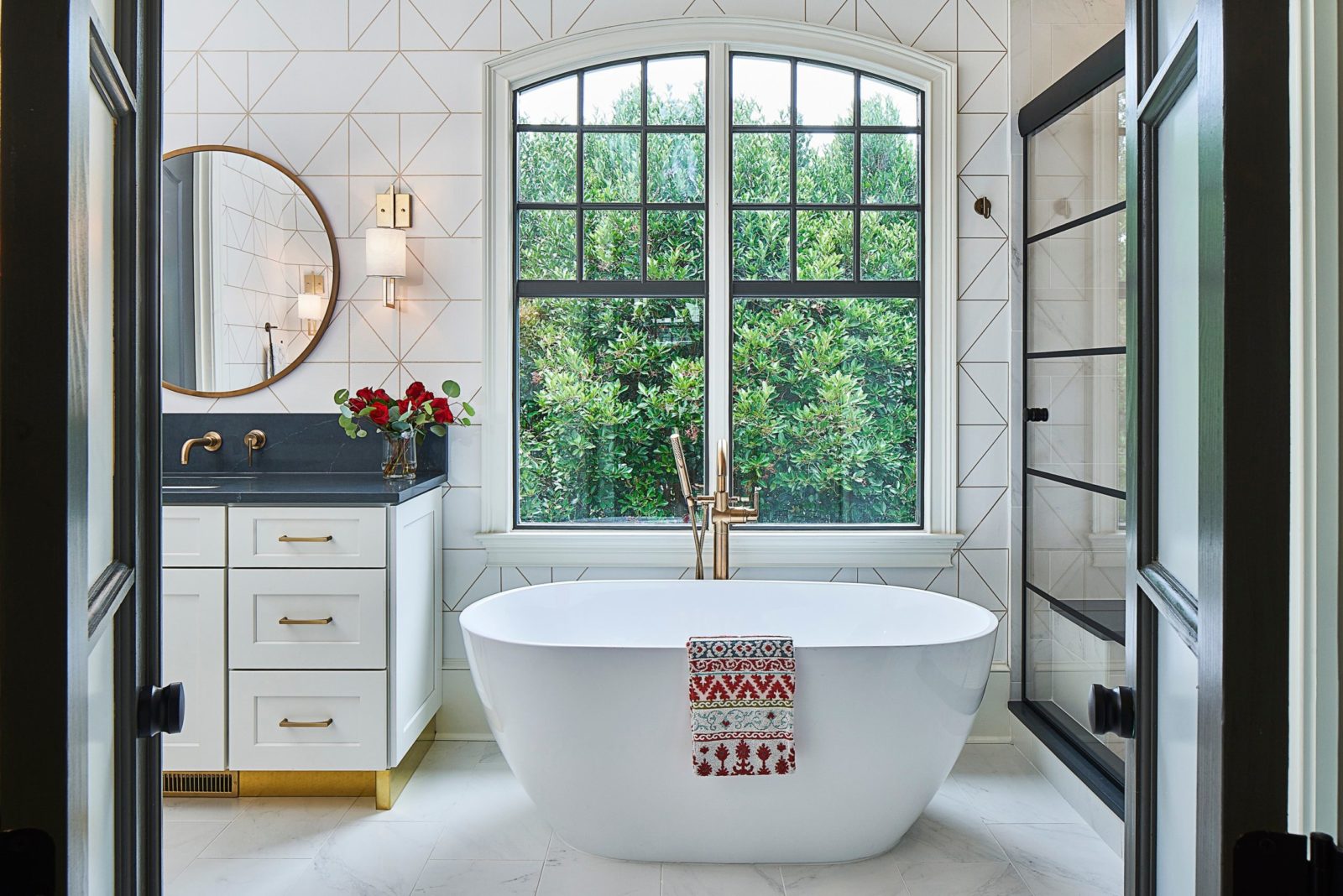 This couple wanted to create a unique master suite that not only reflected the style of the rest of the home but incorporated an international flare. While the design elements of a home’s more public spaces should flow to create a sense of continuity, private spaces like master bedrooms and bathrooms are a great opportunity to try something a little unexpected – like the graphic white and gold wallpaper they selected for the bathroom.