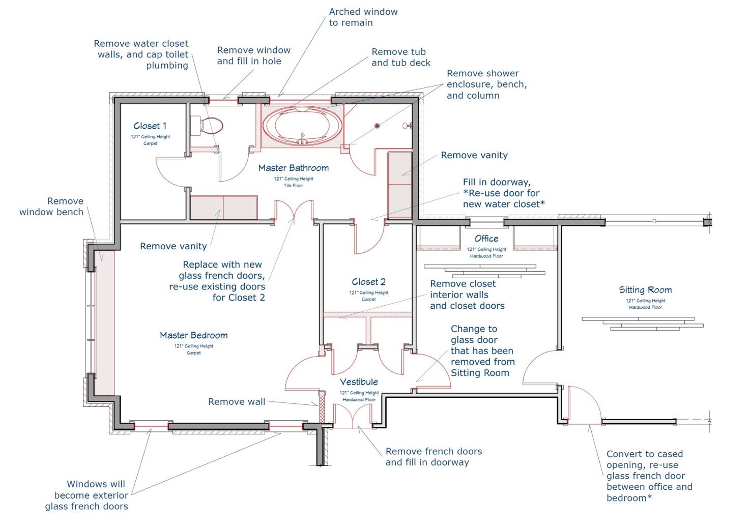 The bedroom remodel features the combination of multiple small closets, providing necessary (but separate) storage space, separate vanities, a larger shower, and a freestanding tub as the focal point while maintaining a private water closet.