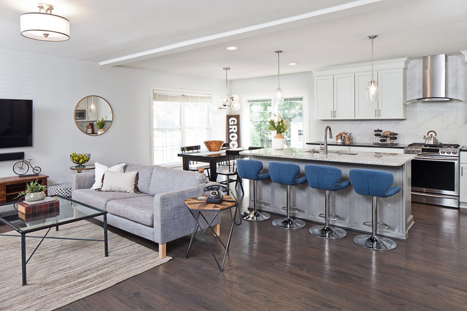 Open spaces offer some benefits. You may feel like you have more living space when you can still see, and connect with family and from separate rooms and entertaining becomes more natural since guests can flow from one area to the next without feeling like they’re encroaching on the host in the kitchen. But often people wonder how to design one space that’s essentially three or four rooms in one? How do you make each room feel separate and unique while still communicating with the rest of the space? We have a few suggestions below: