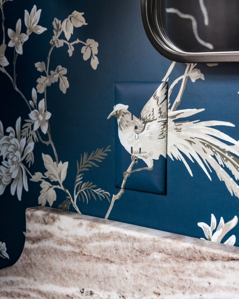 At first glance, the new space appears to be a striking powder room—wrapped in a moody, Asian-inspired bird-and-blossom chinoiserie wallpaper that sets a dramatic tone. The vanity features swoon-worthy fantasy brown marble with a custom curved edge, paired with a matte black sink for contrast and edge.