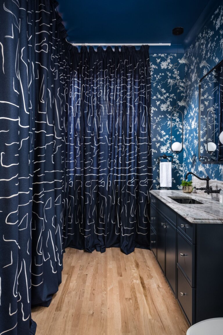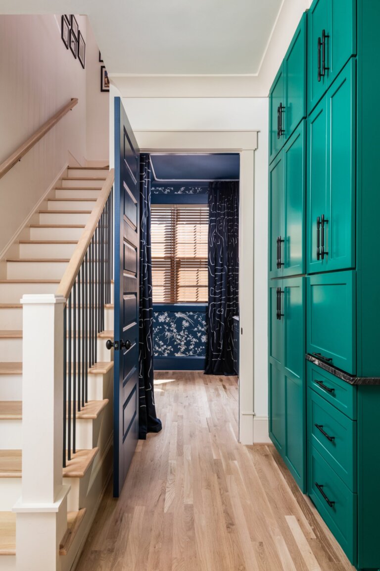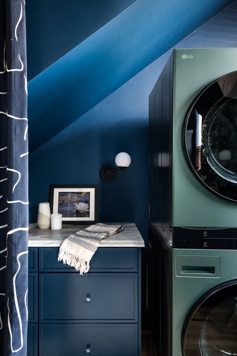 But the real magic is behind the curve: a navy ceiling-mounted curtain system conceals a vibrant green stacked washer and dryer, complete with clever folding and storage zones. What was once awkward and tiny is now bold, efficient, and undeniably cool—a perfect reflection of the playful, color-loving clients who brought it to life with us.