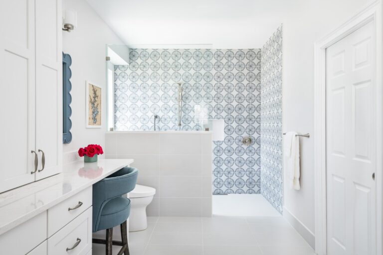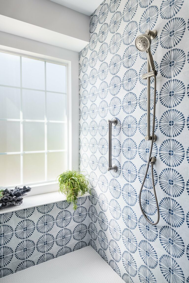 The reimagined layout features a spacious, walk-in curbless shower with a large frosted window for natural light, ensuring her sanctuary is both functional and inviting. Prioritizing the shower as the focal point of the primary bathroom, we installed privacy film on the existing window to ensure ample light.