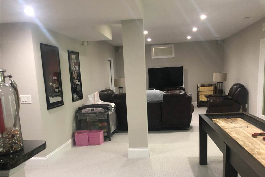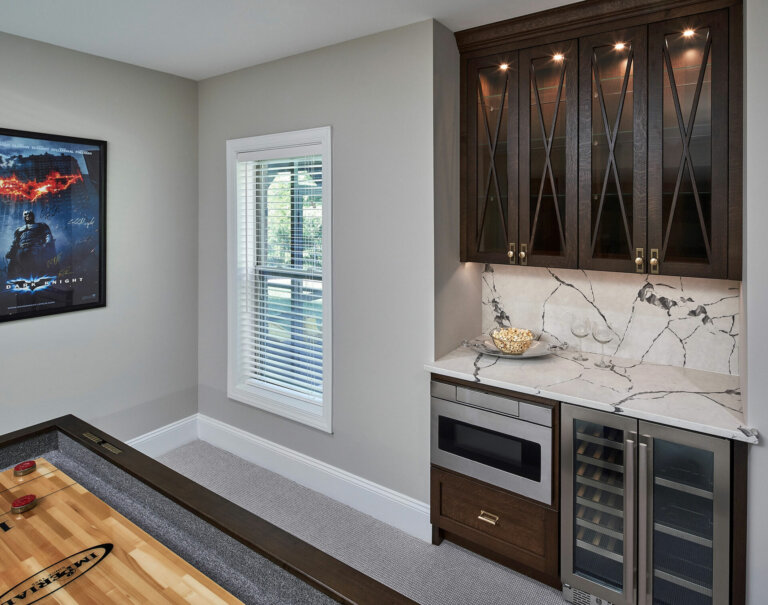 When a long-time repeat client came to us wanting to remodel their spacious basement to serve as the ultimate multi-purpose entertaining space, we couldn’t wait to get started. This couple tasked us with making this space feel comfortable and intimate enough for quiet movie nights with their young daughter, while also being fully capable of hosting their annual Michigan-Ohio State and Super Bowl parties for a few dozen friends. The L-shaped space was quickly divided into distinct zones for various activities to allow their guests to eat, drink and watch games from any zone without restricting their movements or comfort.