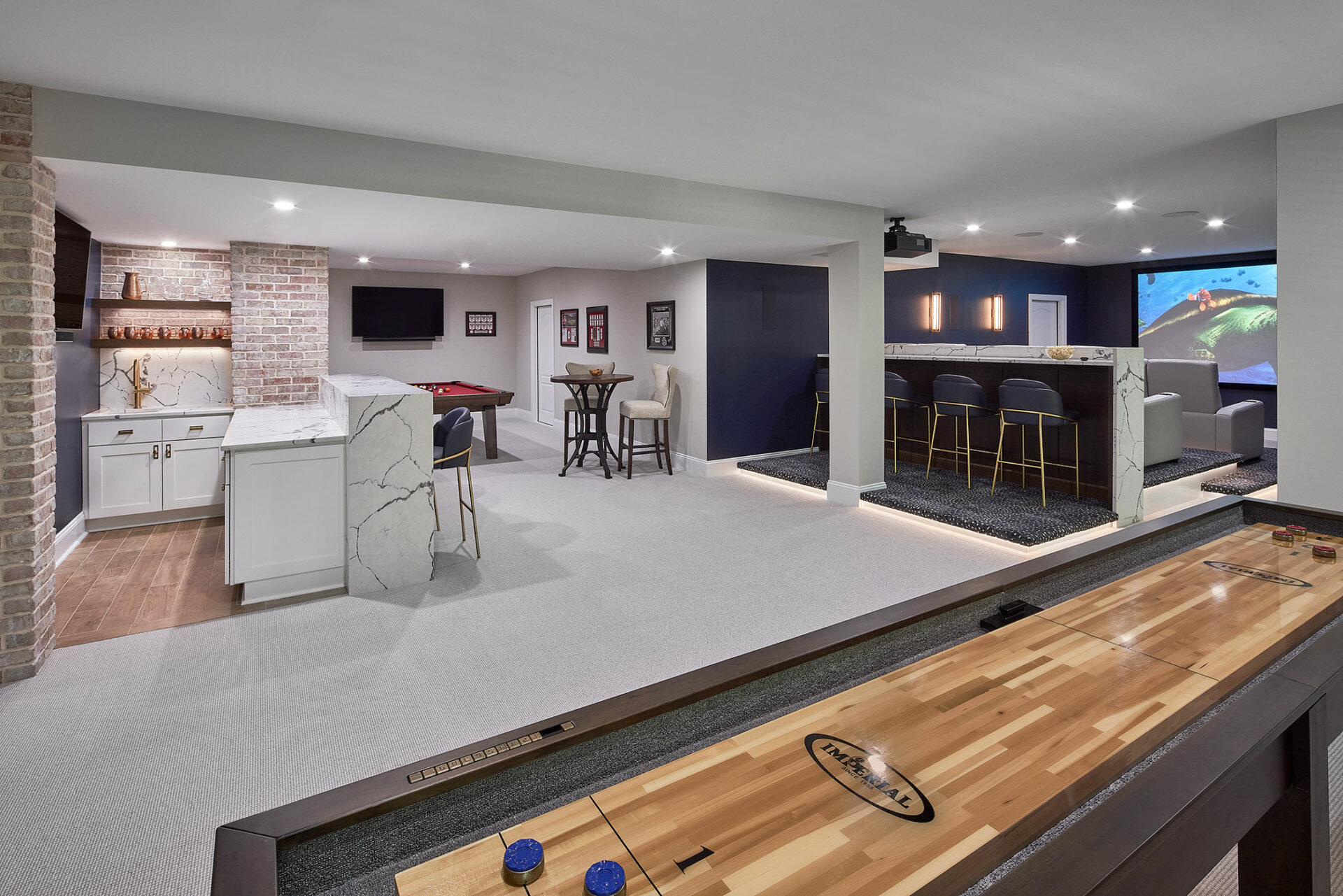 When a long-time repeat client came to us wanting to remodel their spacious basement to serve as the ultimate multi-purpose entertaining space, we couldn’t wait to get started. This couple tasked us with making this space feel comfortable and intimate enough for quiet movie nights with their young daughter, while also being fully capable of hosting their annual Michigan-Ohio State and Super Bowl parties for a few dozen friends. The L-shaped space was quickly divided into distinct zones for various activities to allow their guests to eat, drink and watch games from any zone without restricting their movements or comfort.