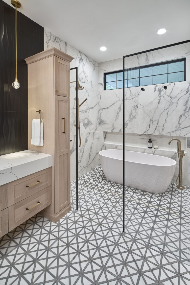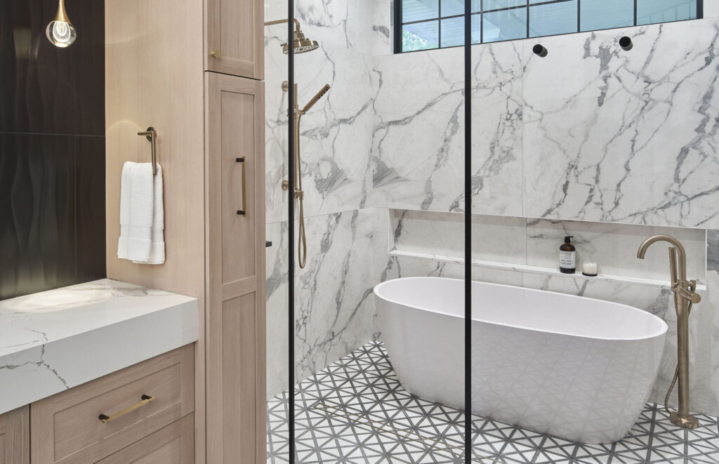 With this bathroom seemingly always being cold, we made sure the client found warmth after stepping out of their newly installed opposite shower fixtures by placing heated floors for comfort, no matter the season. The storage was also a pain point, so our team made sure to include built-in drawers around the bathroom entrance door for linens, towels and other necessities.