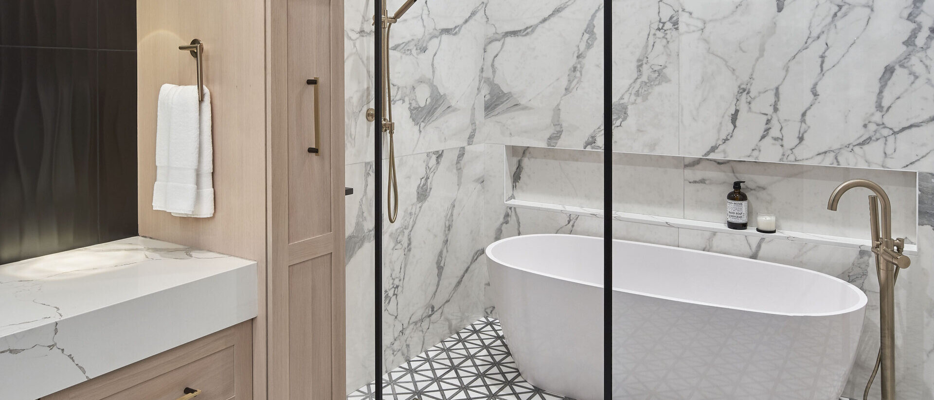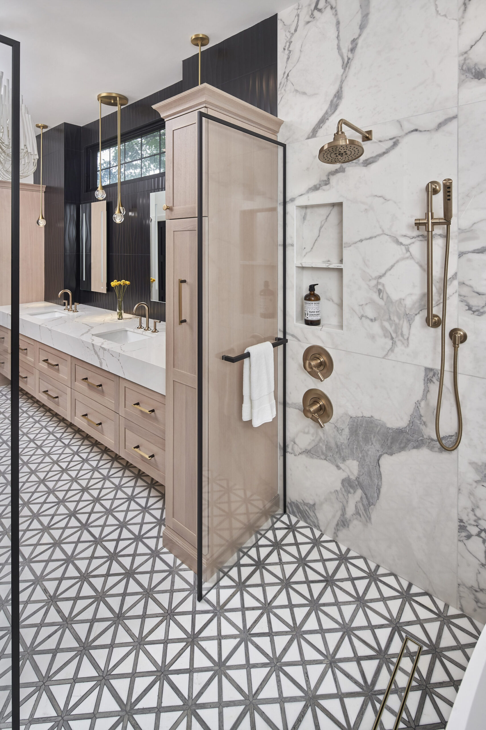 With this bathroom seemingly always being cold, we made sure the client found warmth after stepping out of their newly installed opposite shower fixtures by placing heated floors for comfort, no matter the season. The storage was also a pain point, so our team made sure to include built-in drawers around the bathroom entrance door for linens, towels and other necessities.