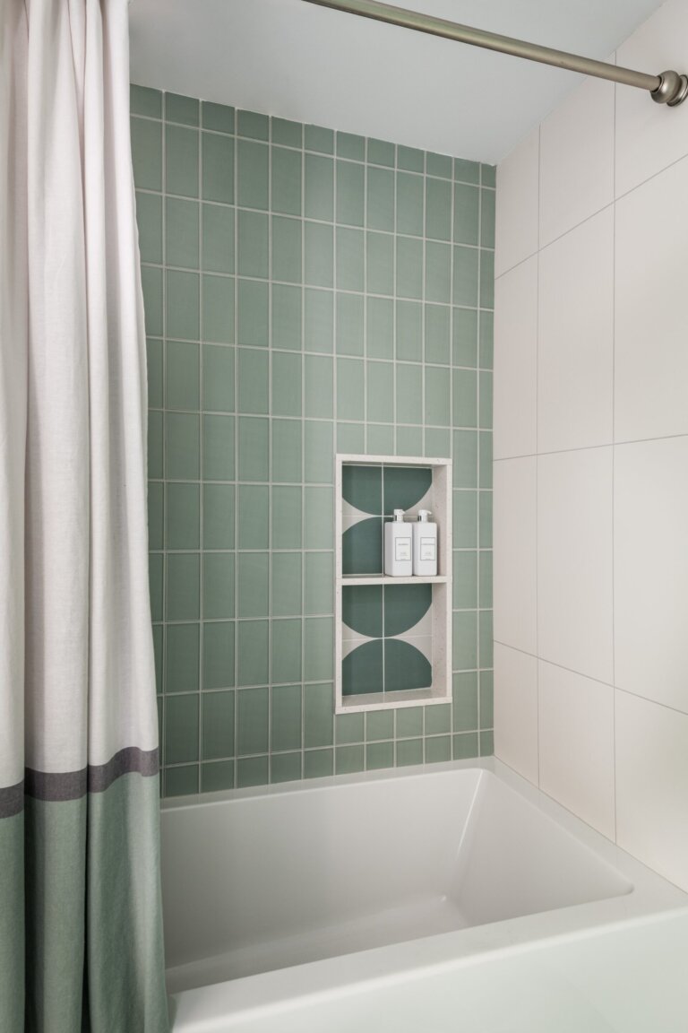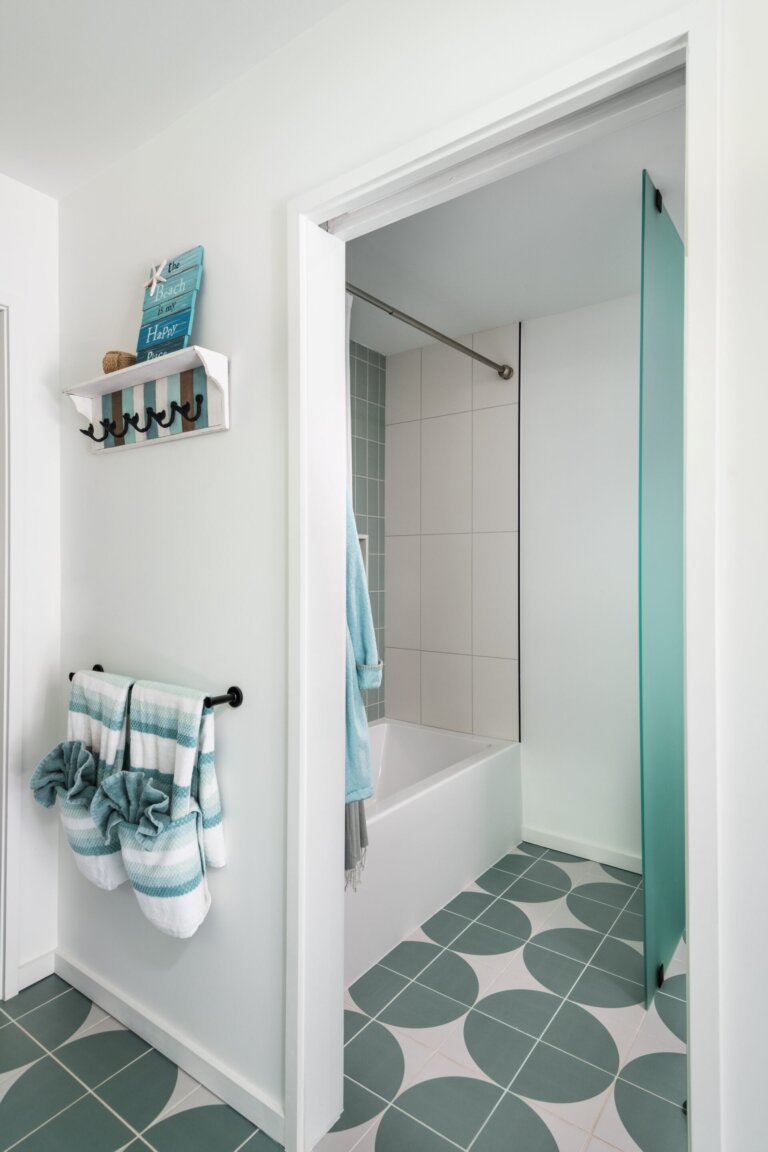 In contrast, the little girl’s bathroom is a delightful mix of playful and sophisticated. A soft peach vanity adds warmth, while a floral-tiled shower niche brings a touch of whimsy, making it a space that can grow with her over time.