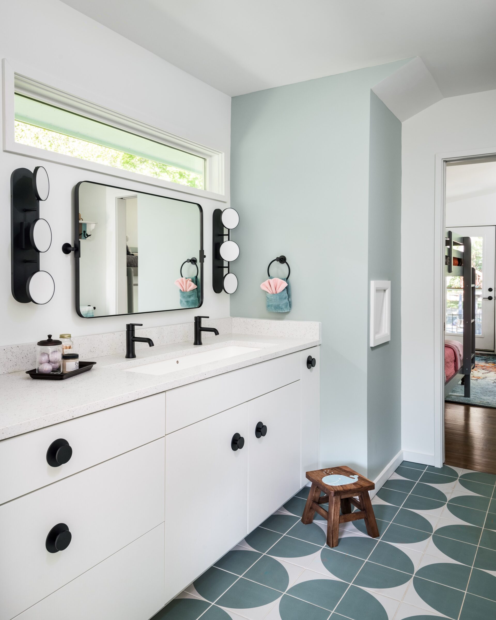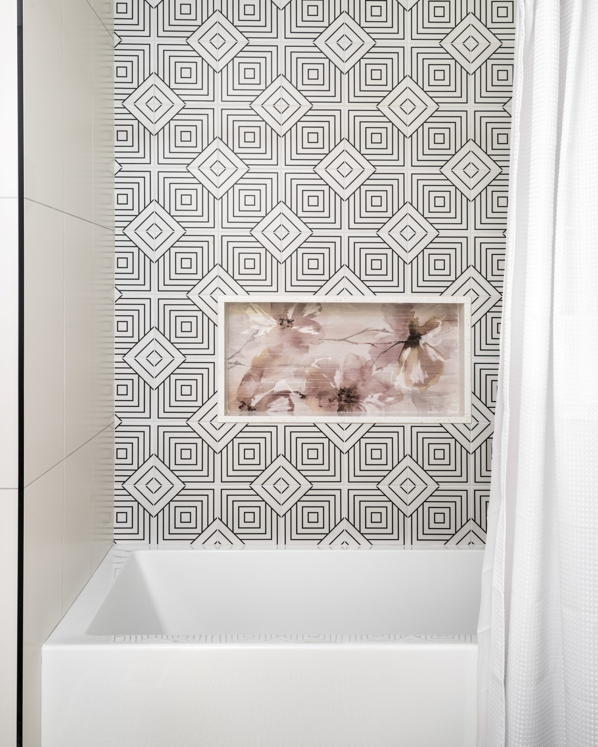 In contrast, the little girl’s bathroom is a delightful mix of playful and sophisticated. A soft peach vanity adds warmth, while a floral-tiled shower niche brings a touch of whimsy, making it a space that can grow with her over time.