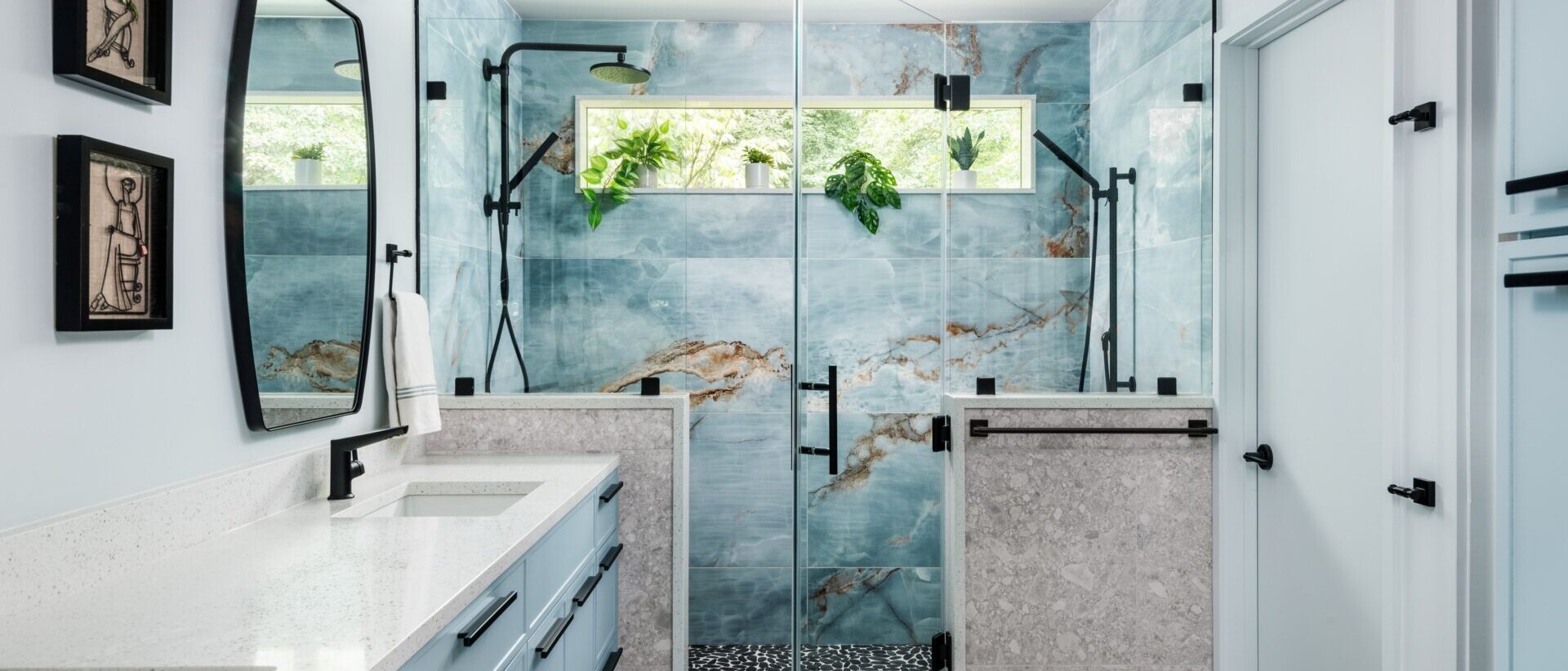 The primary bathroom is a true retreat, featuring a bold walk-in shower wrapped in moody, marble-look tile. A rich blue palette enhances the spa-like atmosphere, complemented by a sleek double vanity that offers both style and practicality.
