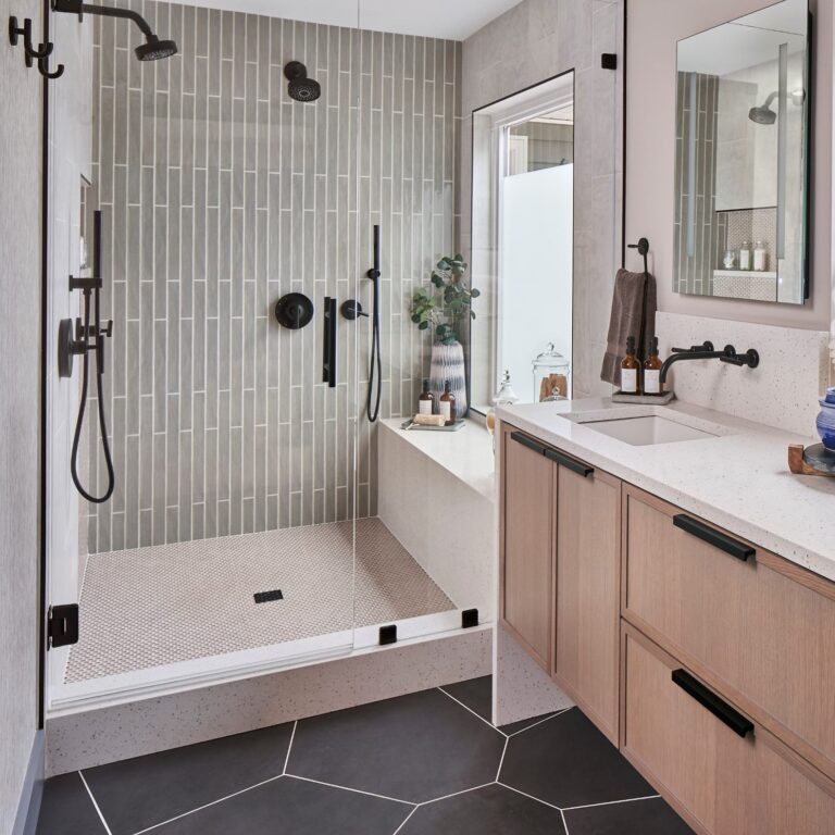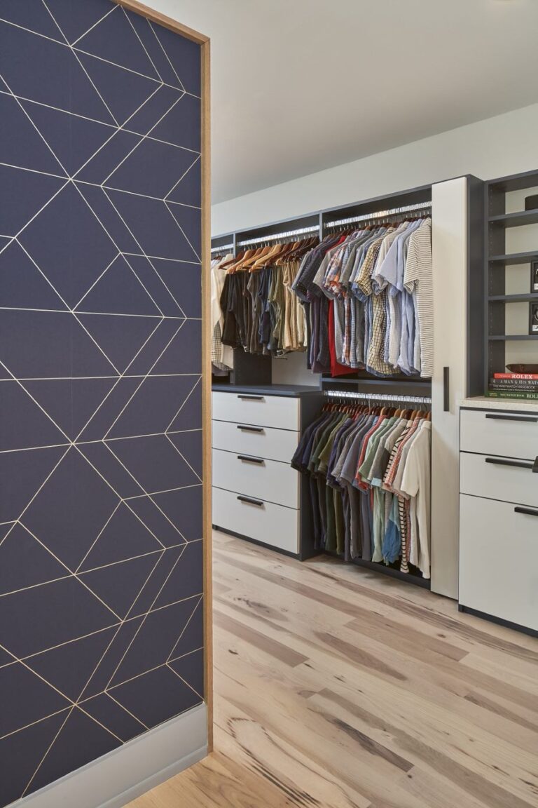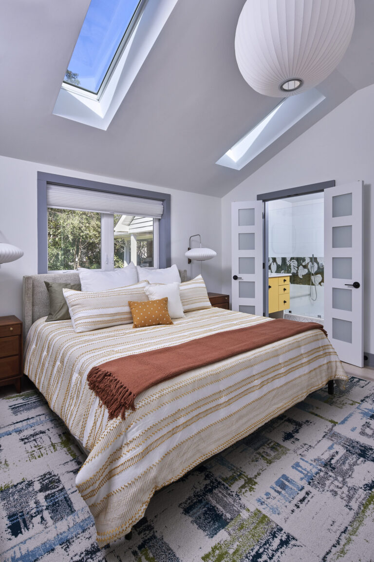 High on their list of primary suite must-have features included all new (and much larger) windows in intentional locations to maximize their Lake Norman views; doubling the size of the walk-in closet; a large, two-person shower, a double vanity, and the simple, clean lines and mixed materials popular in mid-century modern design.