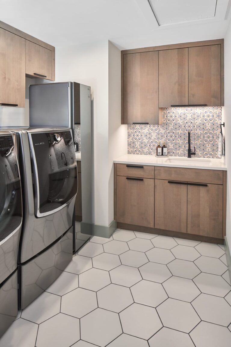Phase one involved completely redesigning the primary suite, the central staircase to the walk-out basement, relocating the laundry room, and eliminating a full bath in favor of a more appropriate powder room. When planning to remodel an entire home in phases without moving out, having a personal refuge to escape to during the construction of the other areas can help minimize stress levels. For this reason we often start with the primary suite as phase one, although in this specific case it was also necessary to prepare for the reconfigurations planned for phase two.