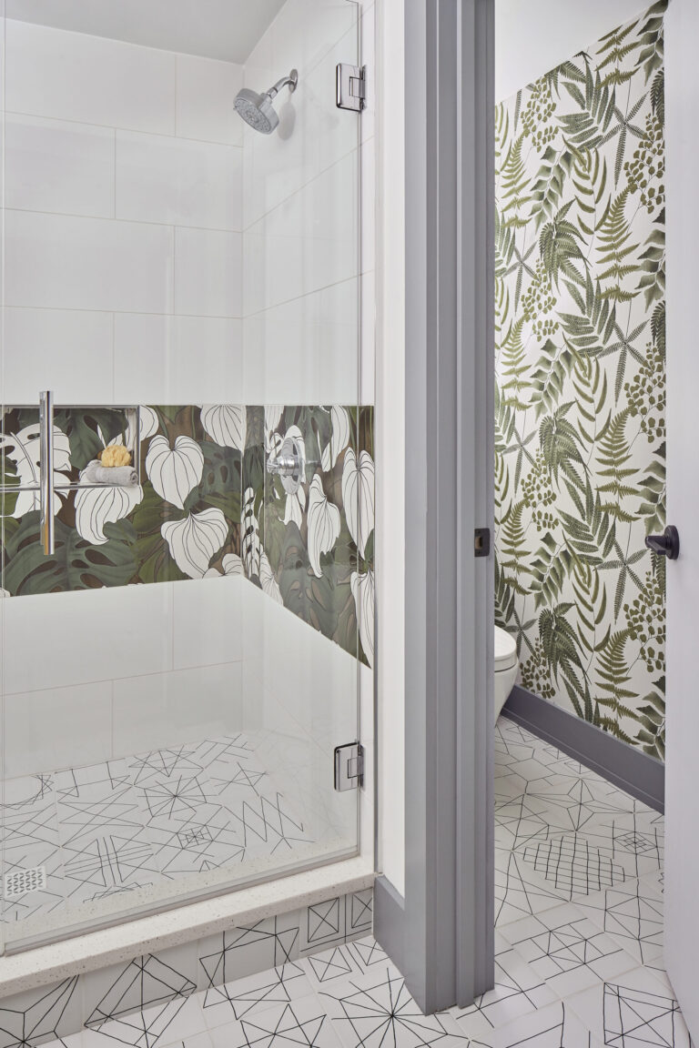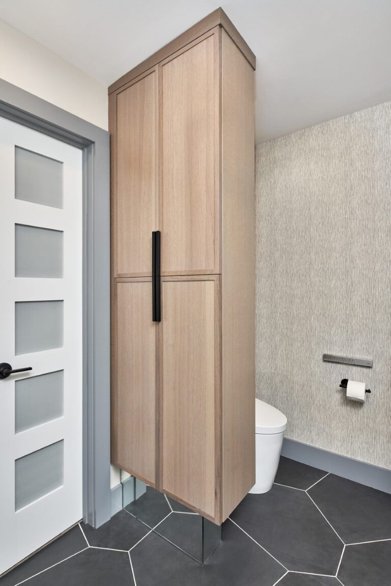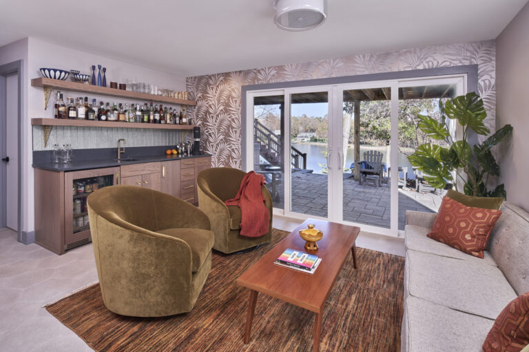 The walk-out basement, clad in painted 70s paneling was far from the lounge space they desired. New tile flooring, accent wallpaper and custom cabinetry created a unique wet bar and entertainment space fit for weekend gatherings. The basic bathroom was brought back to mid-century life with a colorful wall mural, and blush cabinets. A utility alcove at the end of the dark hall was converted into a home office, complete with a clerestory window to enjoy lake views at the standing desk. Opening the staircase created an opportunity to make it an architectural feature, while recessed cubbies below offer convenient shoe storage.