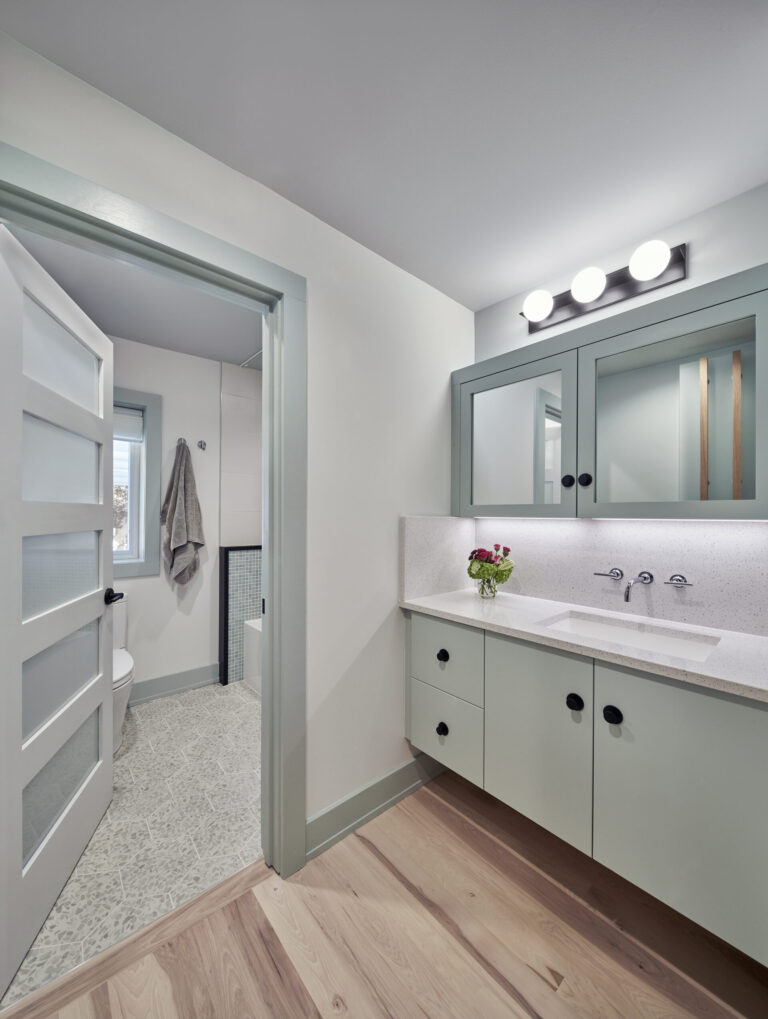 By repeating various design elements throughout each space, the renovated areas in this mid-century modern lake house remodel feel more cohesive and intentional. Continuing this theme throughout each phase ensures that once complete, the whole house will feel like it was designed and executed at one time.