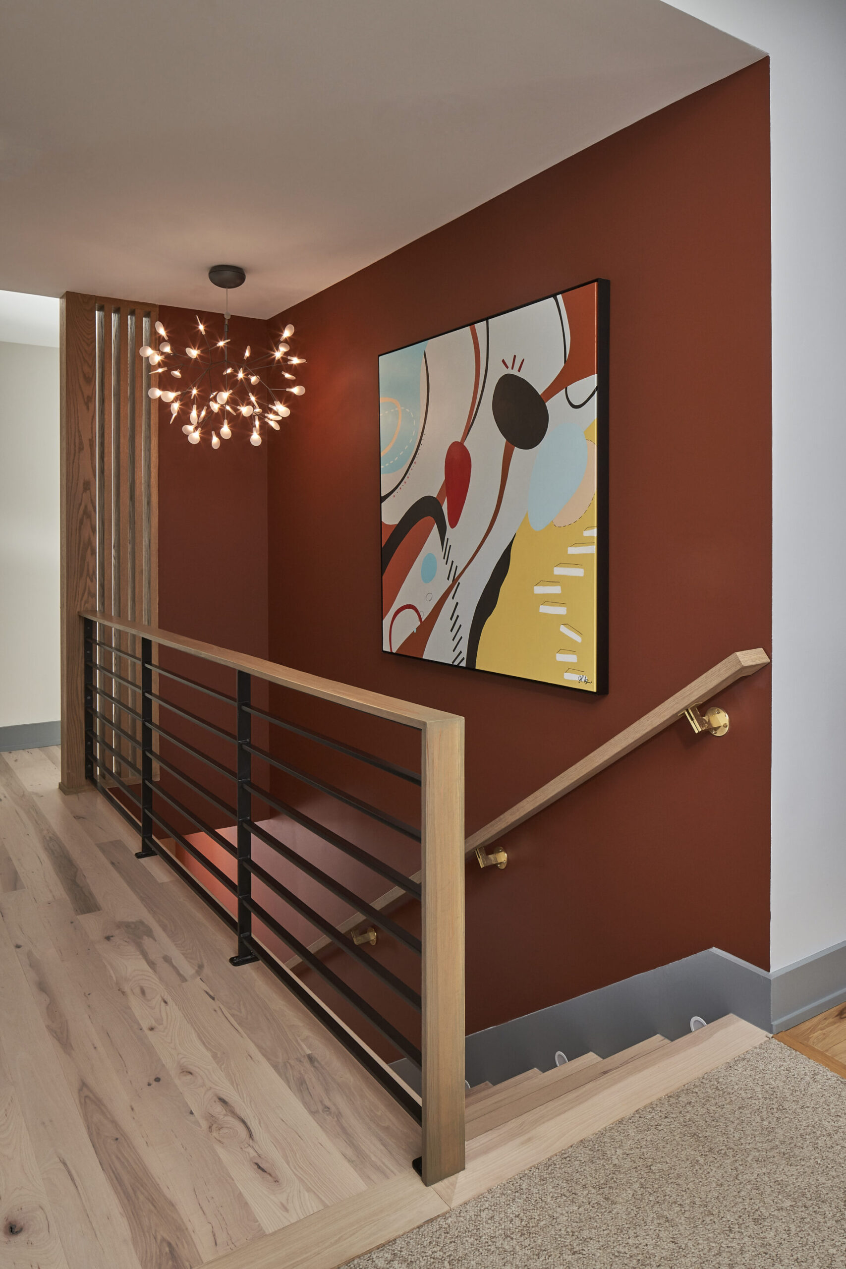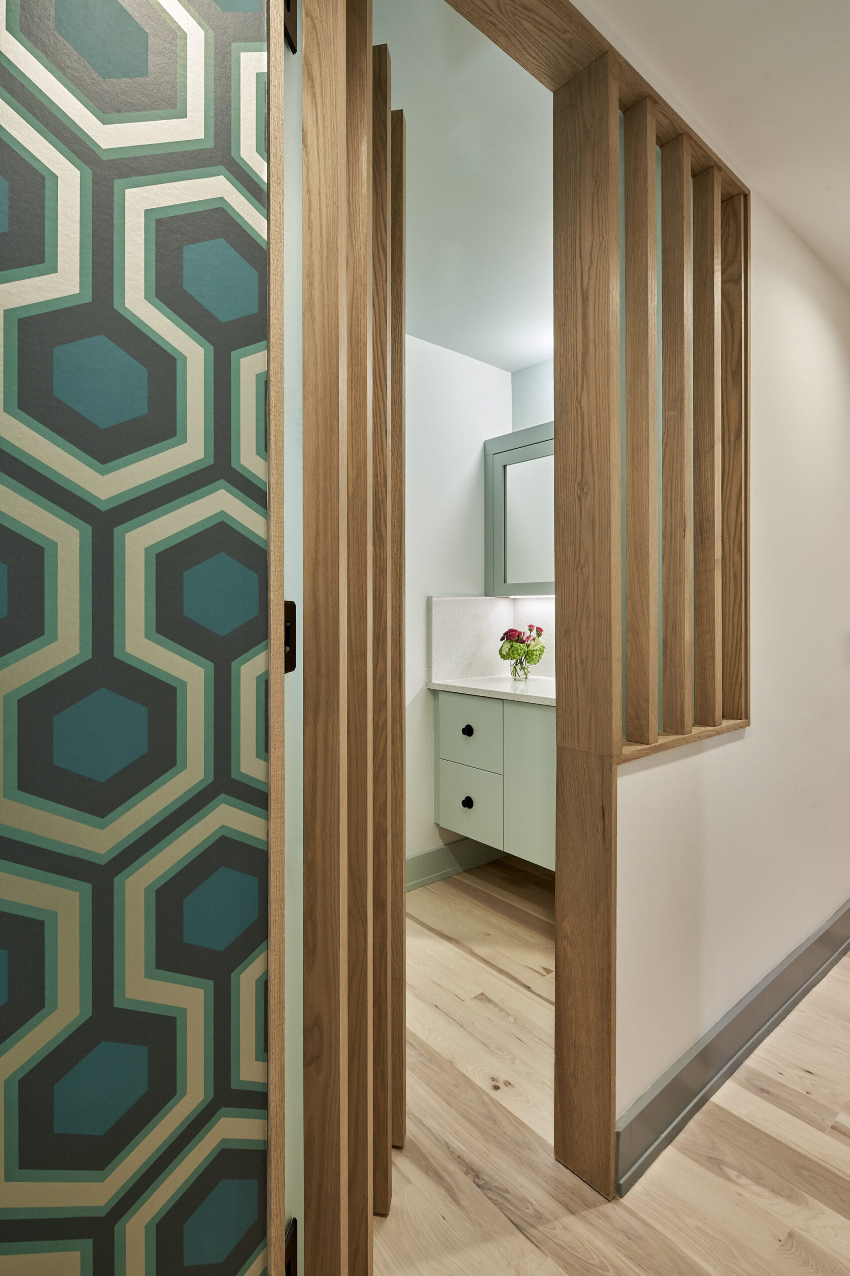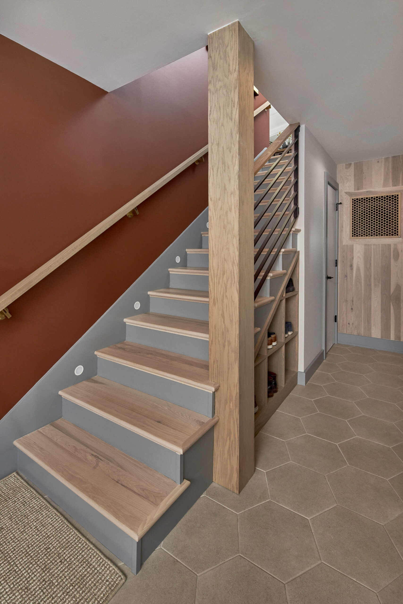 The walk-out basement, clad in painted 70s paneling was far from the lounge space they desired. New tile flooring, accent wallpaper and custom cabinetry created a unique wet bar and entertainment space fit for weekend gatherings. The basic bathroom was brought back to mid-century life with a colorful wall mural, and blush cabinets. A utility alcove at the end of the dark hall was converted into a home office, complete with a clerestory window to enjoy lake views at the standing desk. Opening the staircase created an opportunity to make it an architectural feature, while recessed cubbies below offer convenient shoe storage.