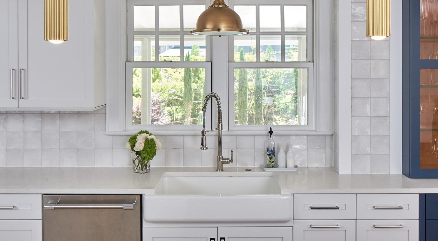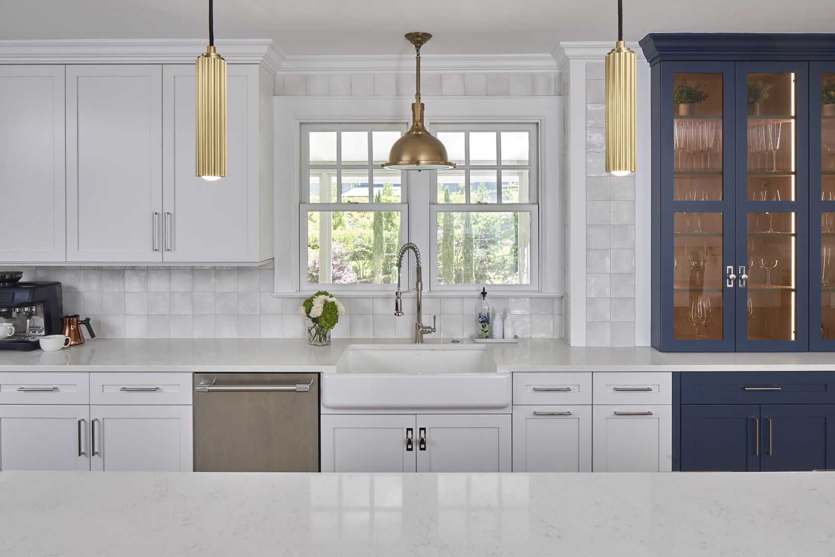 As a major focal point from the great room, the China and stemware cabinet features smoke gray glass that conceals the contents when the interior LED lights are off. When they’re on, it exudes moody lighting that creates the perfect evening glow. White quartz countertops offer a durable surface for all of life’s projects, while the handmade tile backsplash gives this new aesthetic a sense of history, appropriate for the age of this home Plaza Hills home.