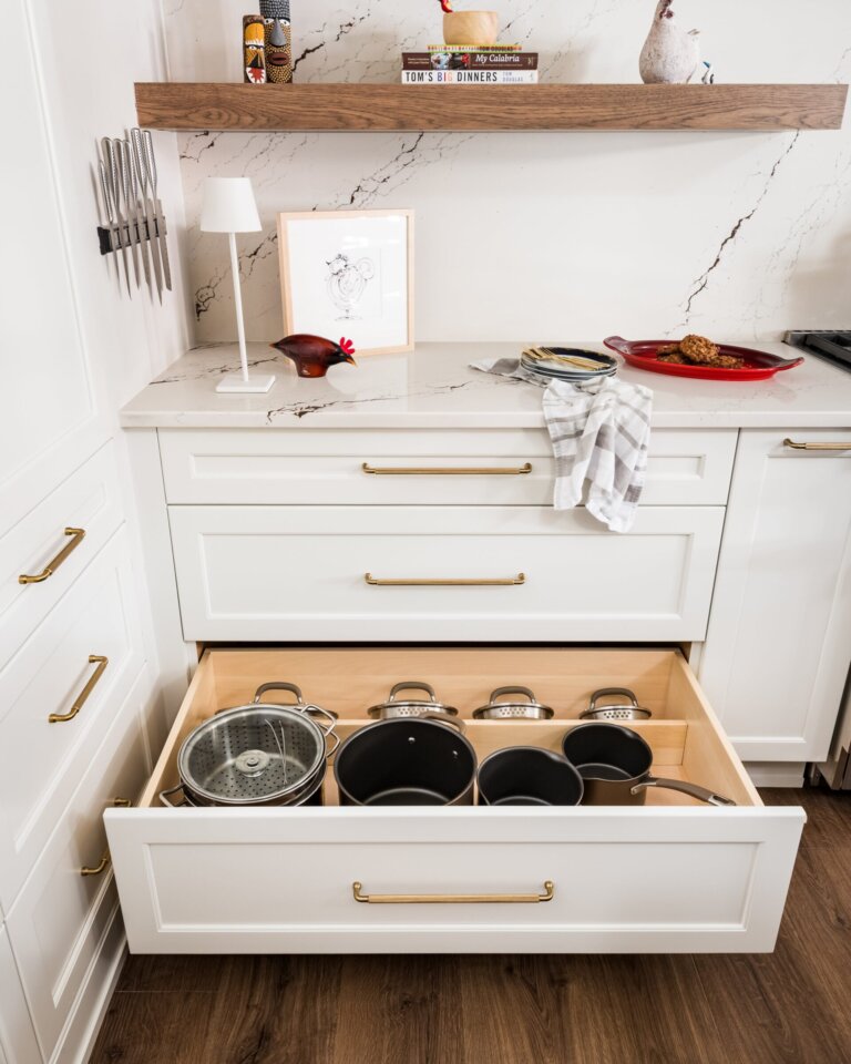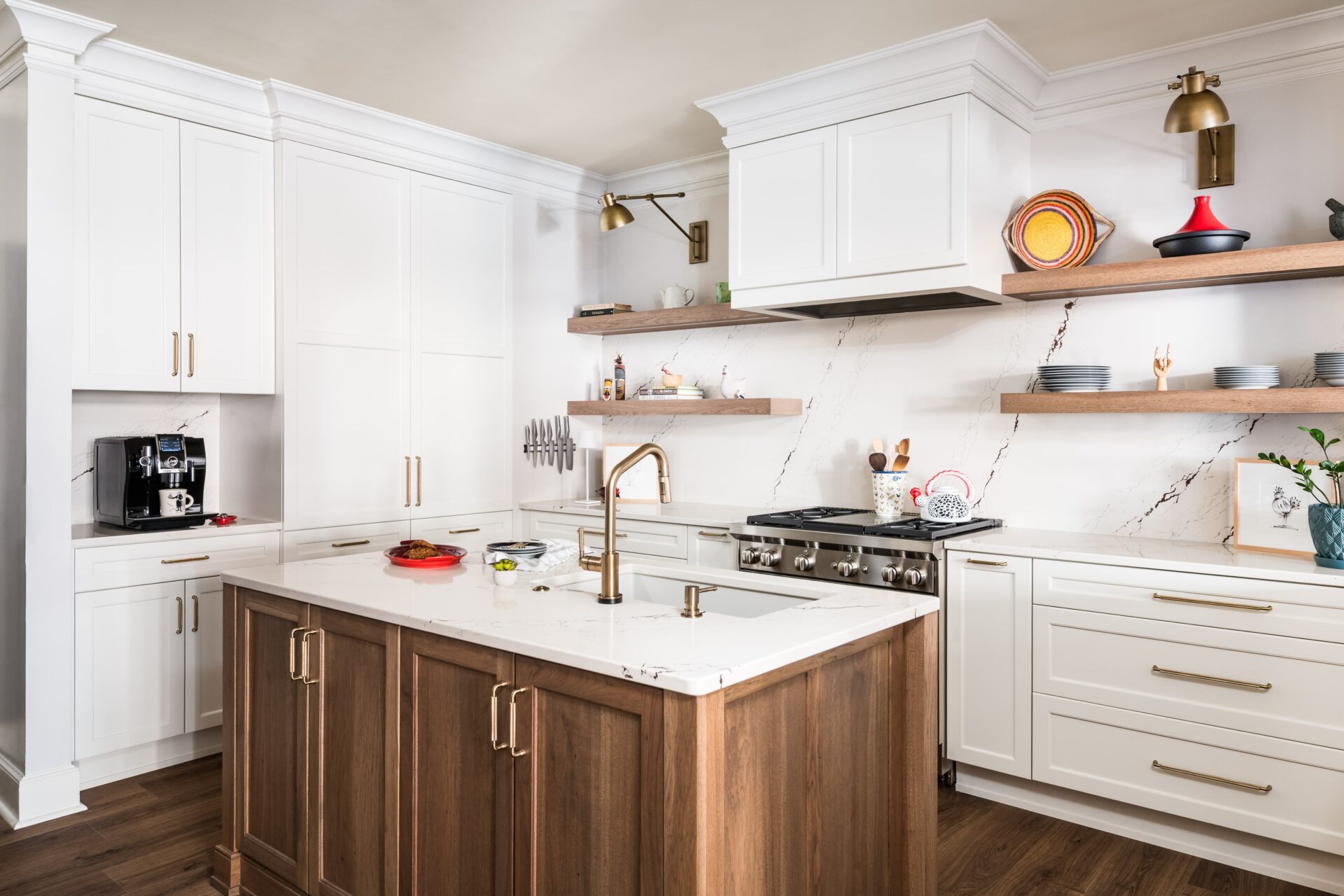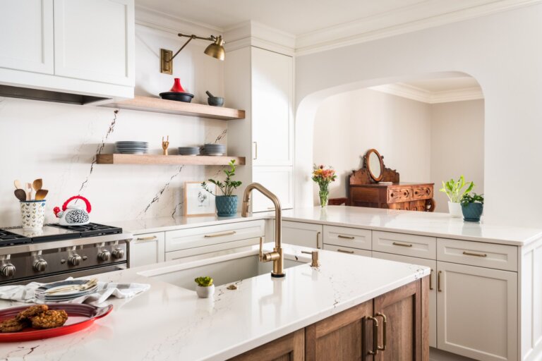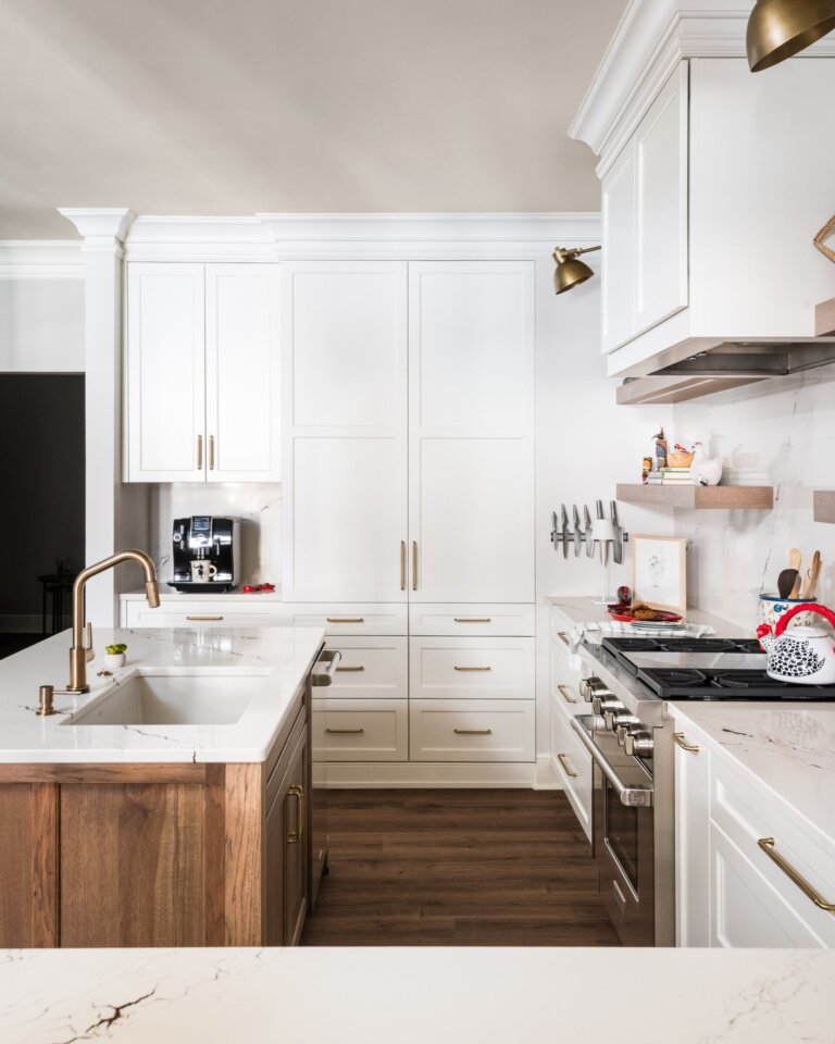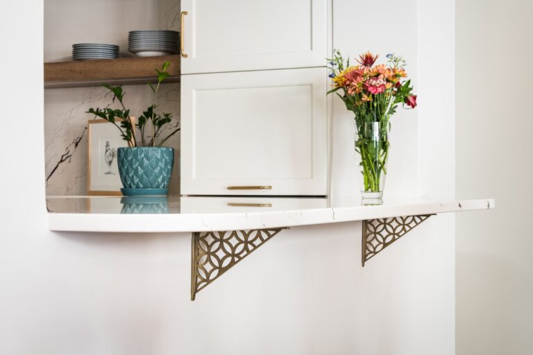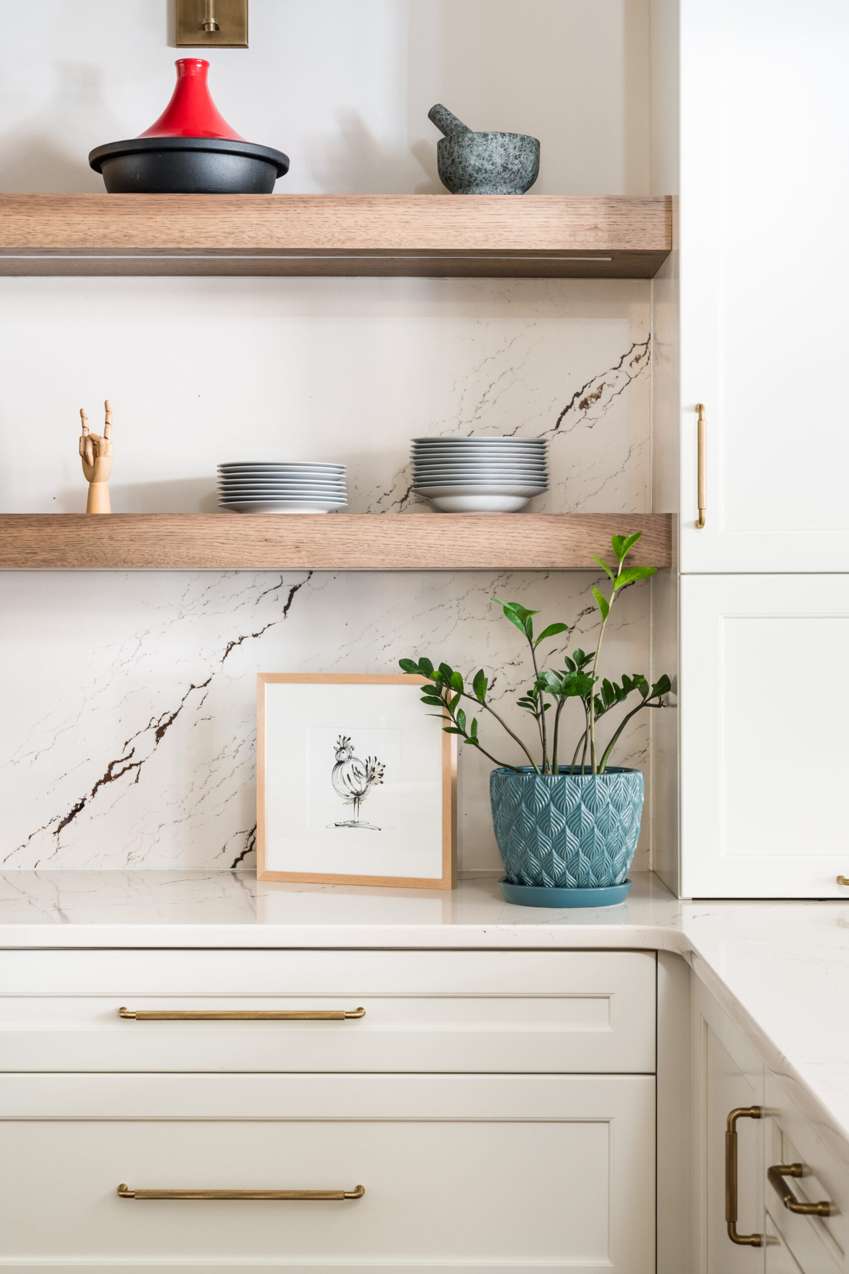 This Uptown Charlotte condo kitchen was transformed into a brighter, more inviting space with warm accents and a modern, approachable aesthetic. Thoughtful storage solutions were custom-designed to tuck away everyday essentials like the microwave, coffee maker, and small appliances, keeping the countertops clean and open. A dedicated display area now highlights the homeowners’ collected art from their world travels—plus a charming assortment of chicken-themed keepsakes that honor the client’s father, who worked in the poultry industry. We lowered the previous owner’s unusually tall counters to a comfortable, standard height and reconfigured the layout to include much-needed pantry storage and expanded prep space. A new bar overhang at the pass-through creates an effortless spot for guests to gather, making this kitchen both functional for daily living and perfectly suited for entertaining.